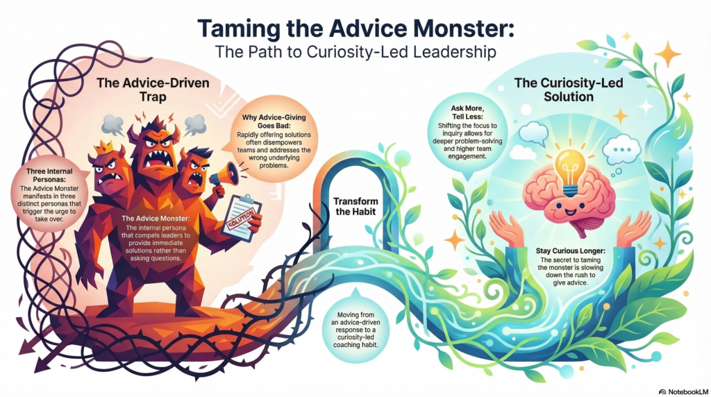 The Advice Monster — a concept popularised by Michael Bungay Stanier — is our instinct to jump in with solutions before we’ve earned the right to.